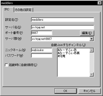 | GMは掲示板等にセッションの日時を記入しますので、その時間帯にチャットルームに入室ください。 (予告無くセッションが開催される場合もあります。セッション参加予定が無くても入室しておくことをお勧めします。) CHOCOAやLimechatなどのIRCクライアントでサーバに繋ぎます。 サーバ名 irc.trpg.net または sv.trpg.net ポート 6667 チャンネル名 #侘庵  CHOCOAでの設定例。メニューバーの「設定」>「IRC」でこの画面に。 ニックネームは管理人が使っているものなので、出来たら違うのでお願いします(笑) ファイアウォールソフトなんかを入れてると不具合が発生するかもしれません。 またこのチャンネルはプレイ前のロビールームとして使用されてます。 (このサーバについてはhttp://www.trpg.net/talk/IRC/で確認できます) |